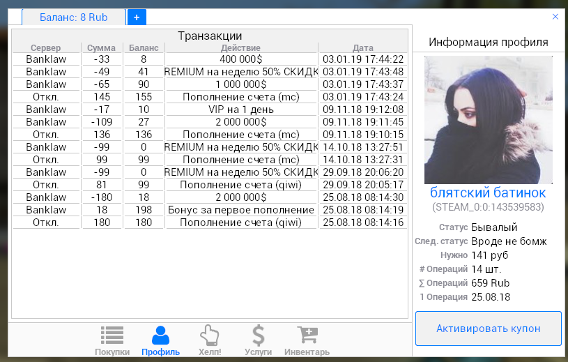 блятский батинок. STEAM_0:0:143539583. Купил PREM на неделю 8 дней назад. Не работало и до сих пор не работает. В инвентаре нет. Хочу получить привилегию. Сервер 2.